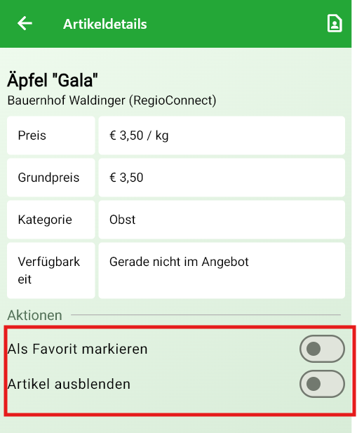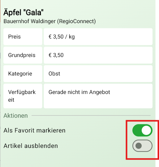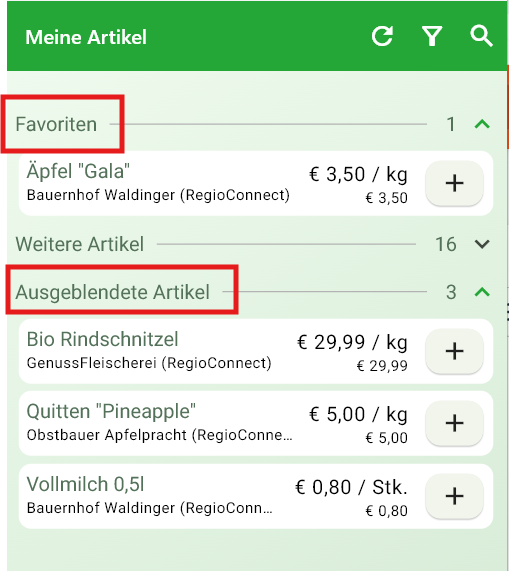 Durch Klick direkt auf einen Artikel, kann dieser zu den Favoriten zugewiesen werden oder ausgeblendet werden.