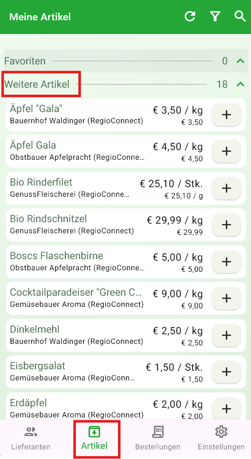 Im Reiter "Artikel - weitere Artikel " werden alle Artikel, von den Lieferanten angezeigt, mit denen du über RegioConnect vernetzt bist.