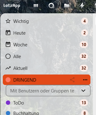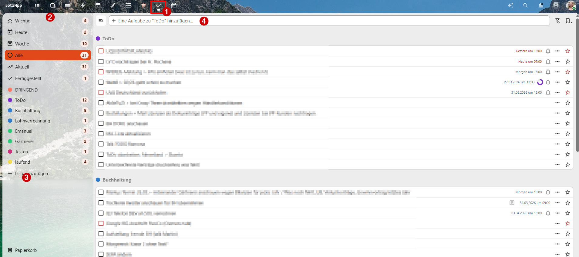 - Übersicht aller Listen und die Aufteilung / Die Zahl im Kreis zeigt die darin enthaltenen Aufgaben an