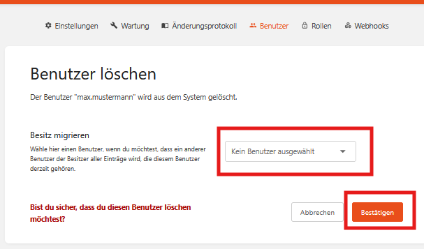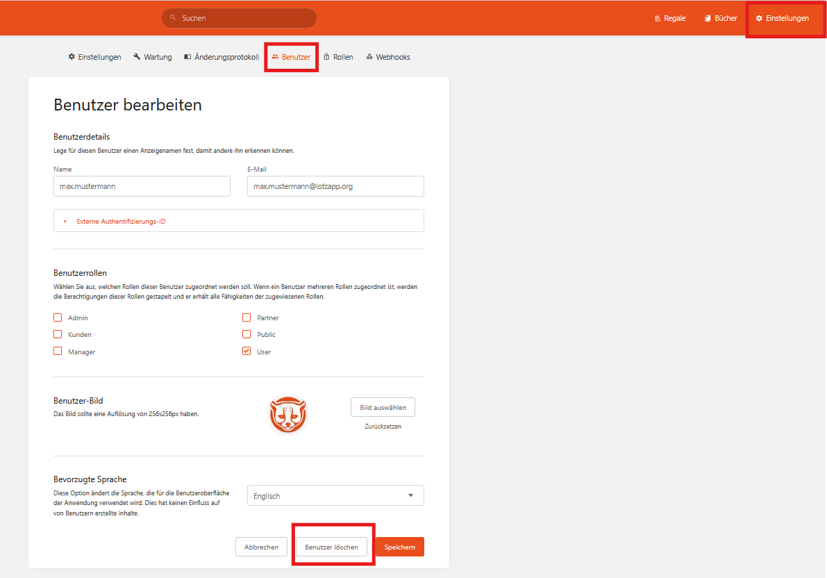 1. Anmeldung als Admin (https://wiki.lotzapp.org) - Einstellungen - Benutzer - Benutzer löschen