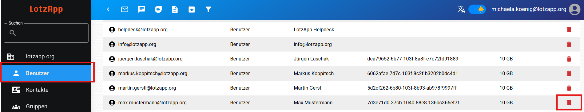 1. Anmeldung als Admin (https://grommunio.lotzapp.work:8443) - Benutzer - User löschen