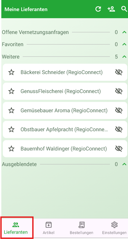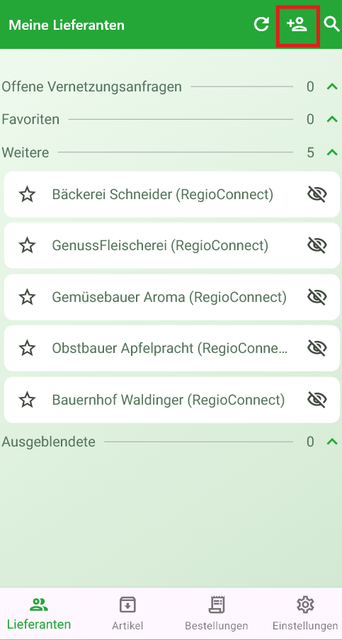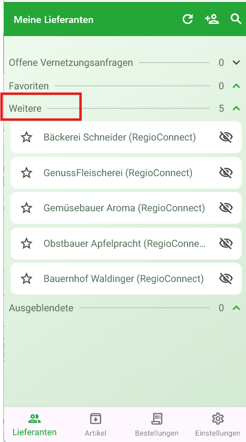 Nun musst du warten, bis der Empfänger die Anfrage akzeptiert hat. Sobald der Empfänger die Anfrage akzeptiert hat, seit ihr vernetzt und du findest den neuen Lieferanten in der Lieferantenübersicht unter dem Reiter "Weitere":