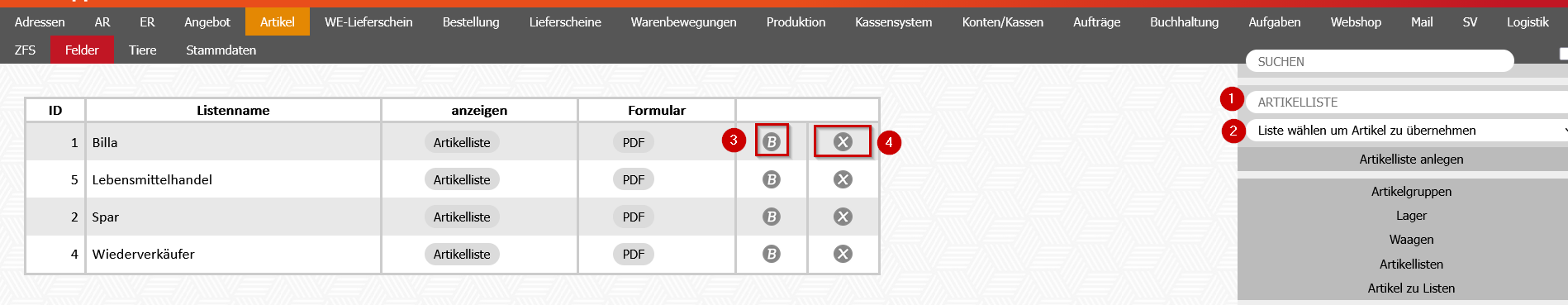 - Es kann eine bestehende Artikelliste kopiert werden. Dazu gibt man im Feld 1 den gewünschten Namen ein, wählt im Feld 2 die bestehende Artikelliste die kopiert werden soll aus und klickt danach auf "Artikelliste anlegen"