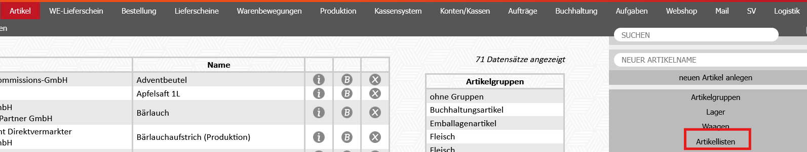 - Name der neuen Artikelliste eingeben und Klick auf "Artikelliste anlegen"