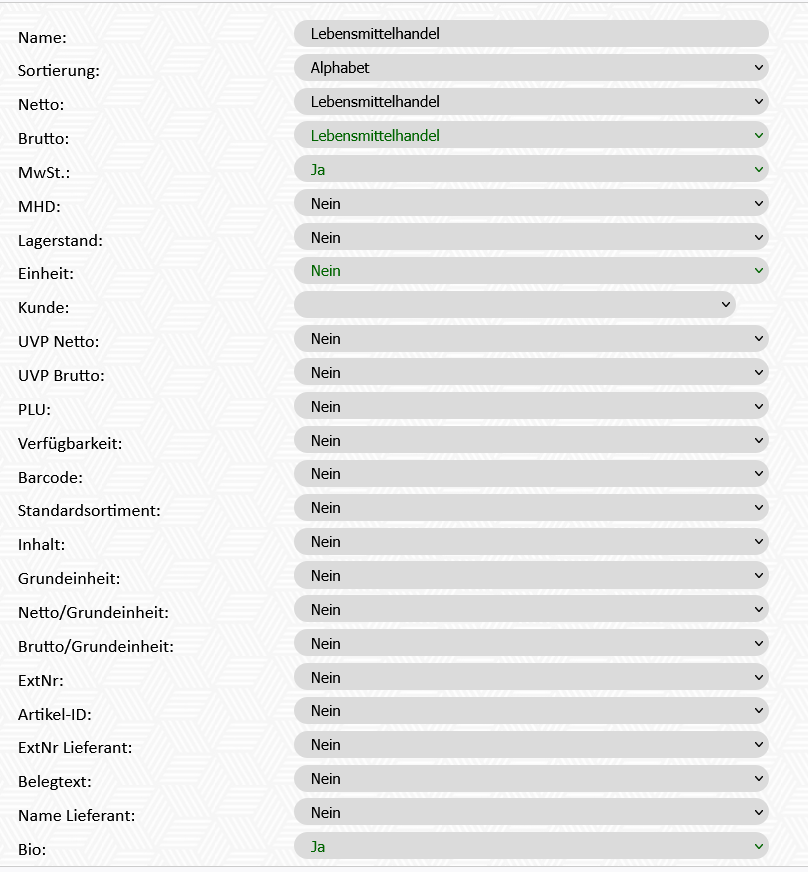 | Standardsortiment | Artikelliste kann hier als Standardsortiment definiert werden. |