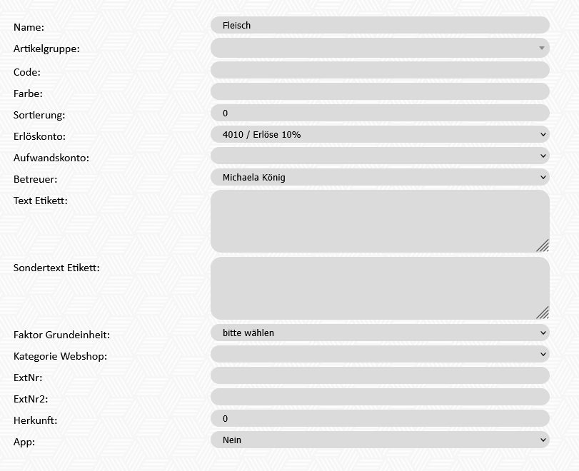 | Artikelgruppe | Die Artikelgruppen können zweistufig gewartet werden. Ist dieses Feld befüllt, ist dies die obere Ebene. z.B.: Name: Huhn, Artikelgruppe: Fleisch - damit ist die Artikelgruppe Huhn eine Unterkategorie der Artikelgruppe Fleisch |