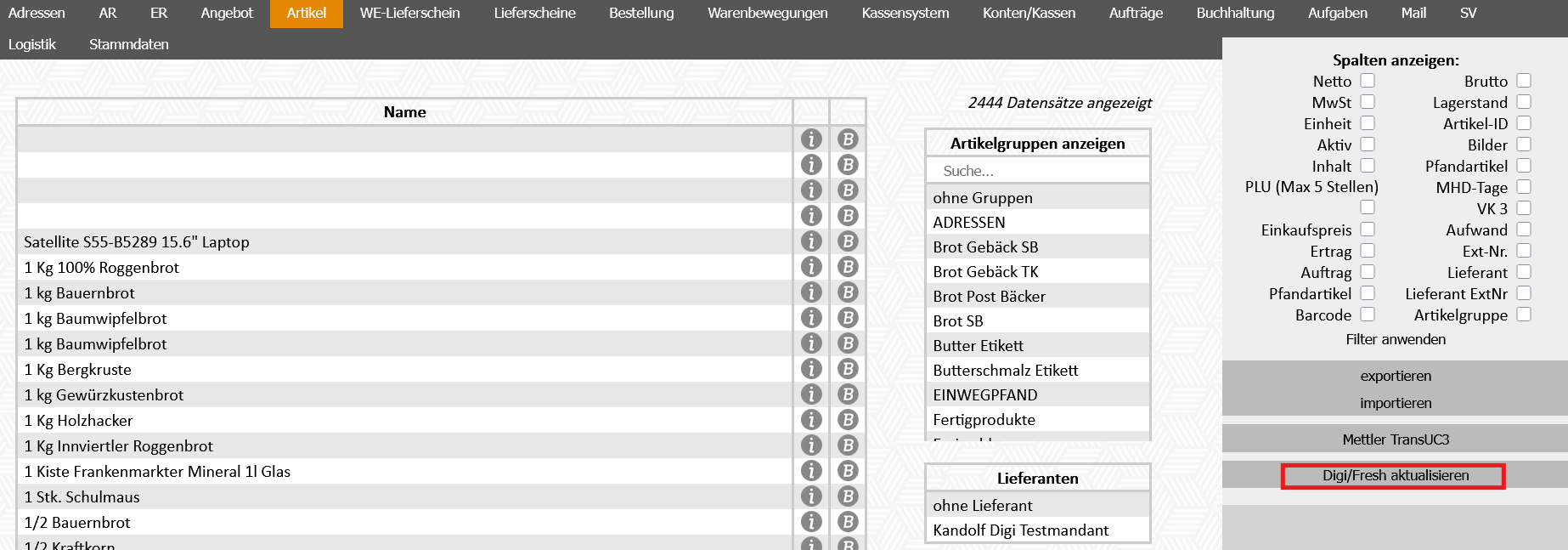 Im Modul Artikel - Digi/Fresh aktualisieren können neue Artikel und Artikeländerungen an Fresh gesendet werden.