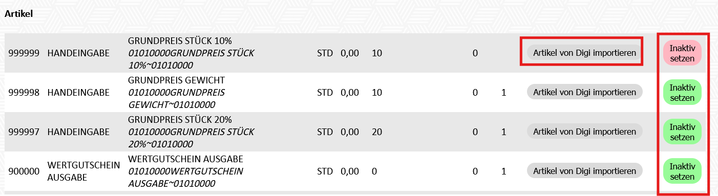 Es werden alle Daten von Fresh angezeigt und können mit "Artikel von Digi importieren" in LotzApp importiert werden oder mit dem Button " Inaktiv setzten" in Fresh auf inaktiv gesetzt werden.