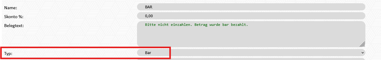 - Bei "Typ" muss unbedingt "Bar" ausgewählt werden (im Feld "Belegtext" kann ein beliebiger Text eingetragen werden):