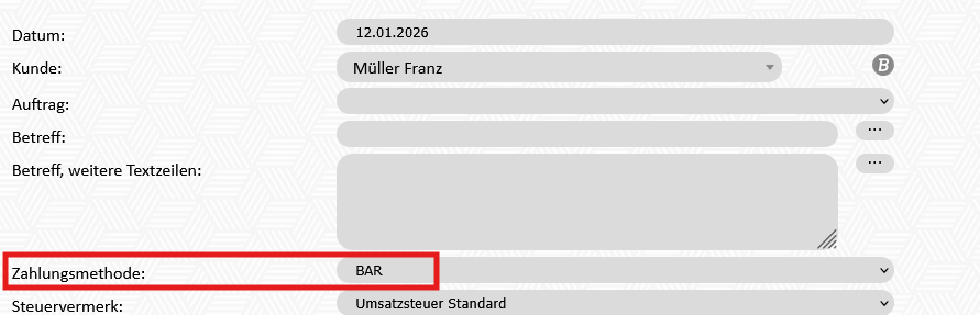 - alle bar bezahlten AR müssen die Zahlungsmethode "Bar" hinterlegt haben: