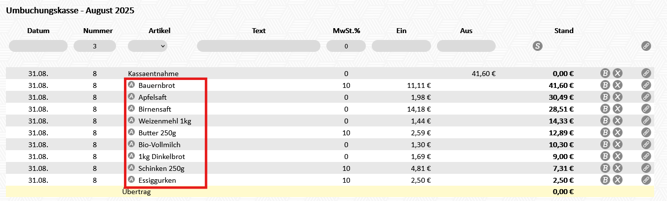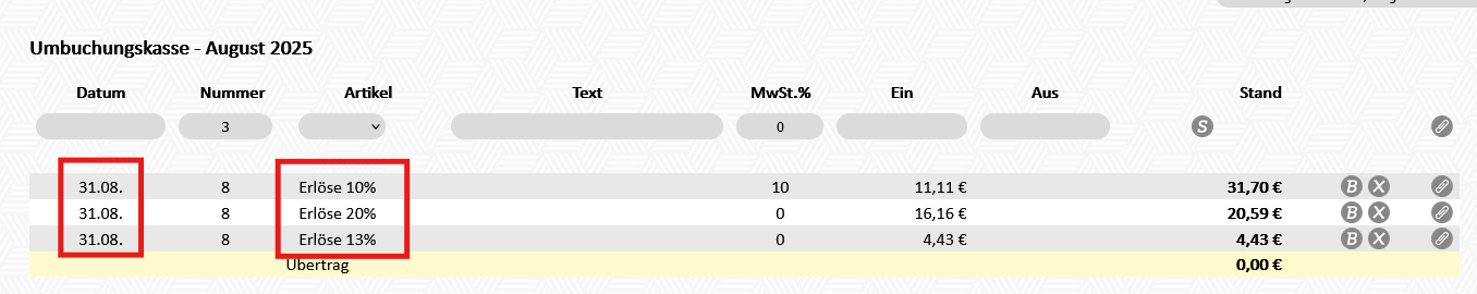 Erst nachdem die Umbuchungskassen eingerichtet wurden, kann mit dem Umbuchen der Kassen begonnen werden.
