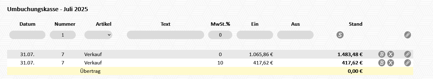 3. Nun werden die Umsätze von der Registrierkassa in die Umbuchungskasse übernommen und summiert