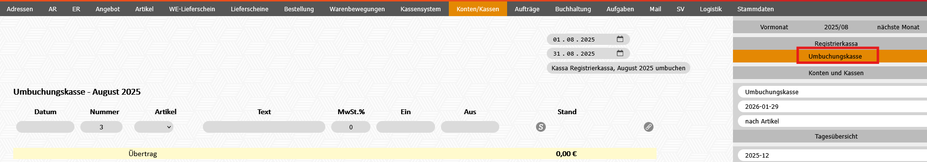 - Modul Konten/Kassen - Umbuchungskassa auswählen
