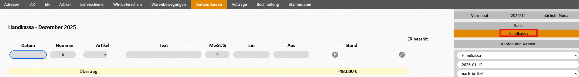 - Modul Konten/Kassen - Handkassa auswählen