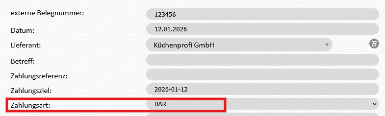 - alle bar bezahlten ER müssen die Zahlungsmethode "BAR" hinterlegt haben: