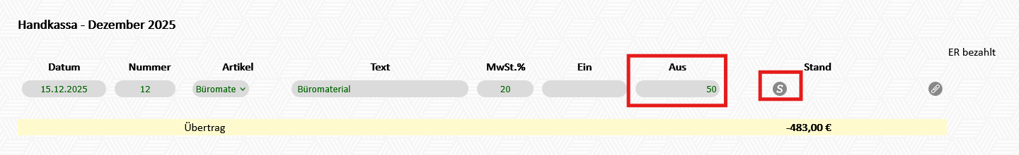 - Rechnungsbetrag bei "Aus" eingeben - Klick auf "S" (=speichern"):