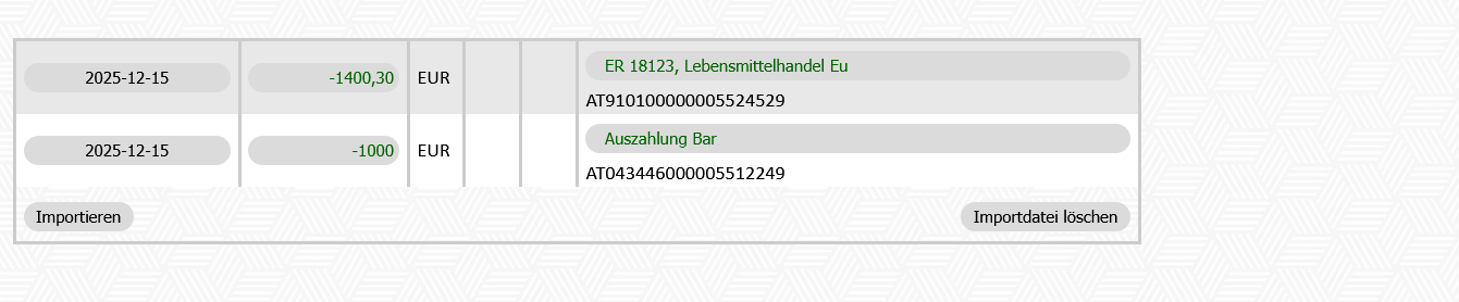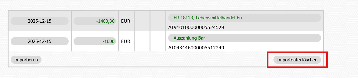 Ist die Datei fehlerhaft oder wurde eine falsche Datei hochgeladen, kann diese nochmal durch Klick auf "Importdatei löschen" gelöscht werden