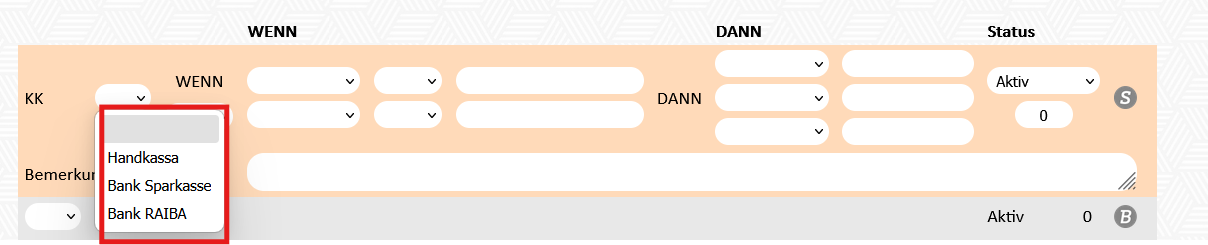 4. Wurde zuvor "KK" (=Konten/Kassen) ausgewählt, wird nun im nächsten DropDown die jeweilige Kasse/das jeweilige Bankkonto gewählt