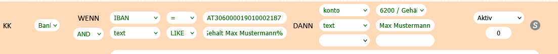 Bei dieser Regel wird im Bereich "Wenn" nach dem IBAN des Stromanbieters gesucht. Zusätzlich wird in der Spalte Text mit der Einstellung "Like" gearbeitet. Durch die Verwendung von Like in Kombination mit den Prozentzeichen (%) vor und nach dem Suchbegriff wird im gesamten Textfeld nach diesem Text gesucht. Die Prozentzeichen sind unbedingt notwendig, damit der text unabhängig von seiner Position im Buchungstext erkannt wird