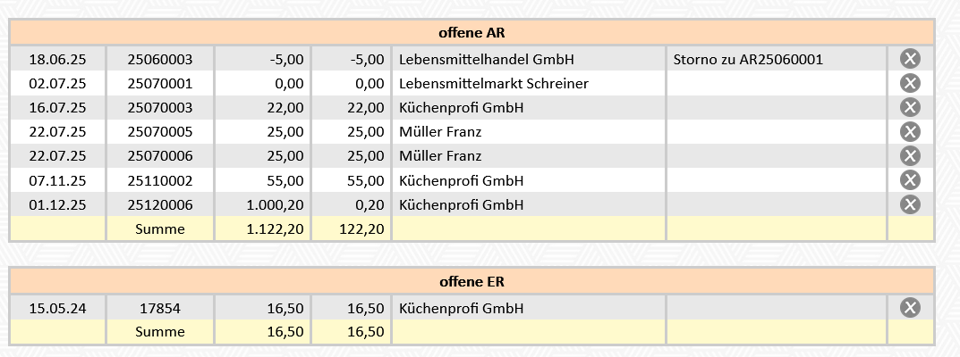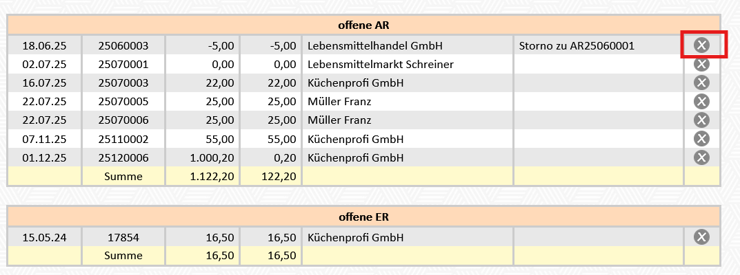 Wurde eine Rechnung versehentlich nicht über ein Bankkonto/Kasse ausgeglichen und stattdessen direkt auf ein entsprechenden Konto verbucht, kann diese in der OP-Liste mit Klick auf "X" entfernt werden. Dadurch bleiben Rechnungen nicht länger als offener Posten bestehen und die OP-Liste ist akutell.