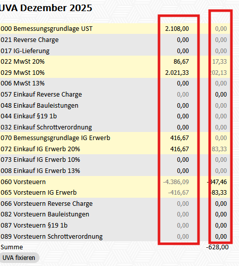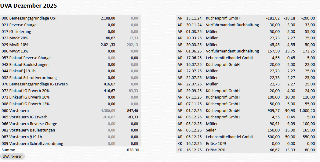 Nach Abgabe der UVA klickt man auf "UVA fixieren". Dadurch wird die aktuelle UVA gespeichert und abgeschlossen (graue Hinterlegung). Ab diesem Zeitpunkt werden alle neuen Buchungen automatisch der nächsten UVA-Periode zugeordnet.