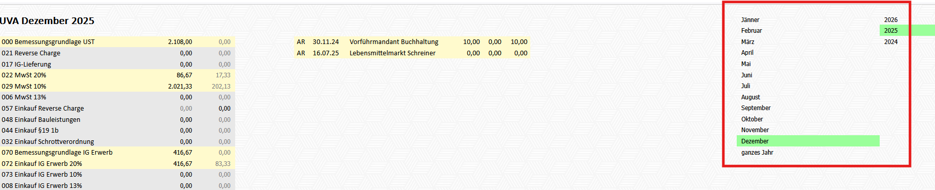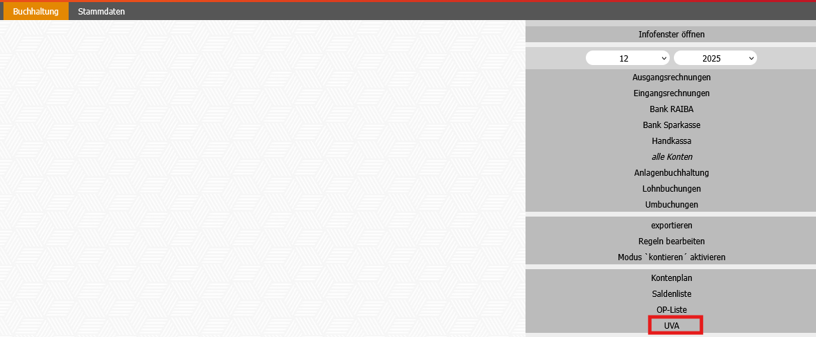 Rechts im Schirm kann ausgewählt werden, für welches Monat oder welches Quartal (je nach Einstellung) die UVA angezeigt werden soll.
