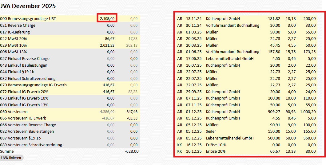 Links im Schirm sieht man die UVA-Übersicht. Klickt man auf einen Betrag, erhält man eine Detailansicht, auf welchen Buchungen sich dieser Betrag zusammensetzt.