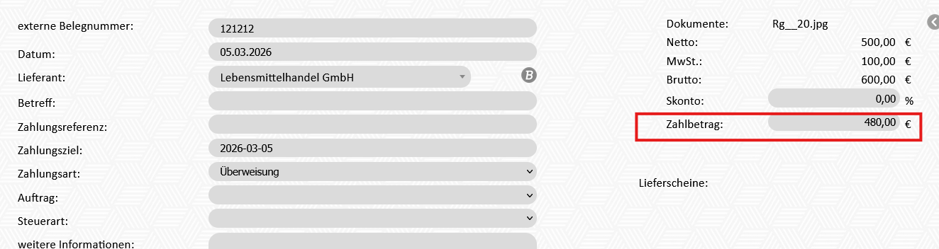 Wenn das Überweisungsfile erstellt wird, wird somit nur noch der verminderte Betrag als zahlbetrag angezeigt. Der Bruttobetrag des Beleges bleibt derselbe.