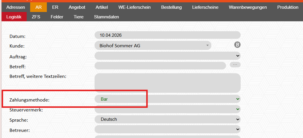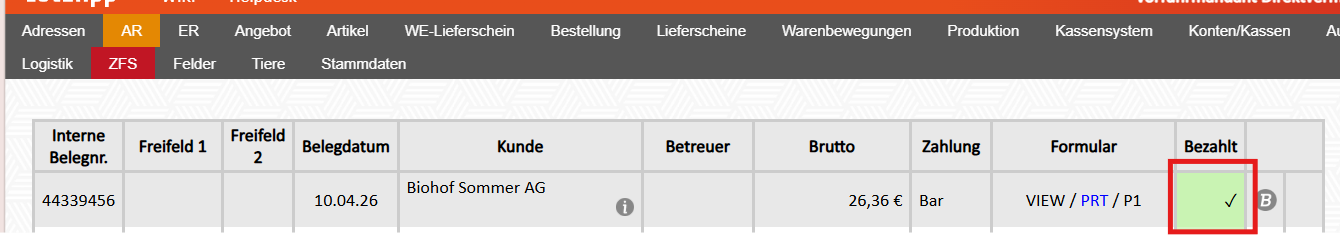 Bei der Rechnung muss die Zahlungsmethode Bar hinterlegt sein