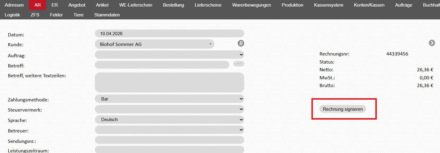 3. Sobald bei der Ausgangsrechnungen die Zahlungsmethode Bar hinterlegt ist, erscheint rechts der Button "Rechnung signieren":