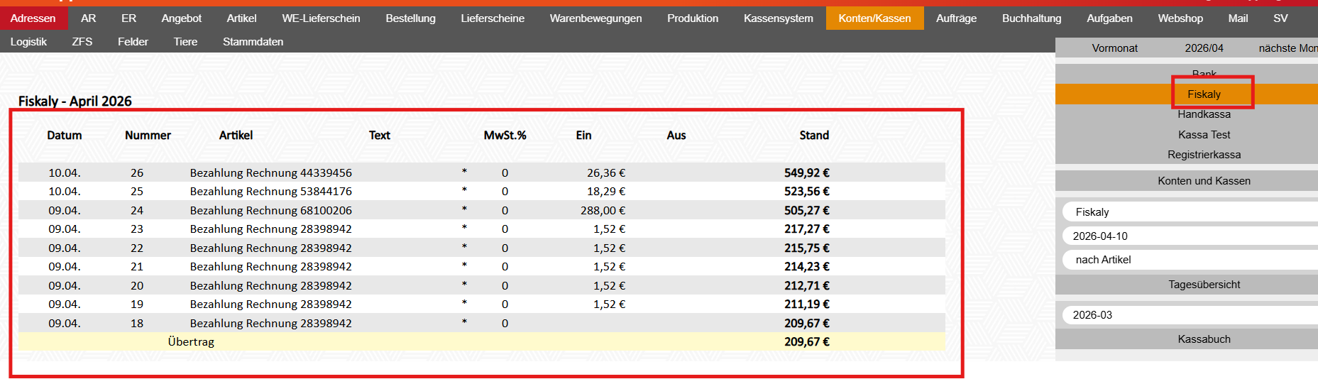 6. Im Modul "Konten/Kassen" werden alle bezahlten Rechnungen in der Registrierkasse angezeigt: