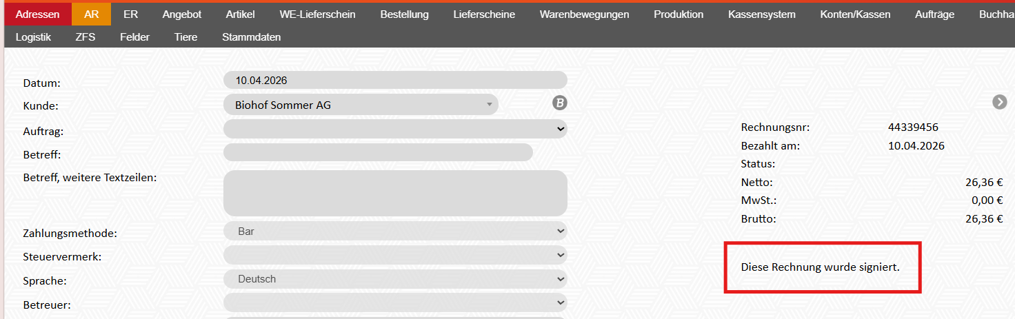 4. Wurde die Rechnung erfolgreich signiert, erscheint die Info "Diese Rechnung wurde signiert". Weiters wird die Rechnung mit heutigem Datum auf bezahlt gesetzt.