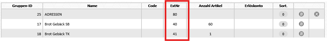 Das die Artikelgruppe mit Fresh verknüpft ist, erkennt man daran, dass in der Spalte "ExtNr" die Nummer der Artikelgruppe im Fresh angezeigt wird