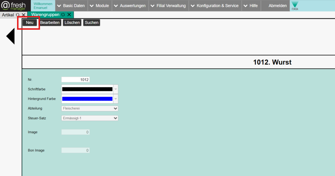 - Klick auf "Neu" um eine neue Artikelgruppe anzulegen