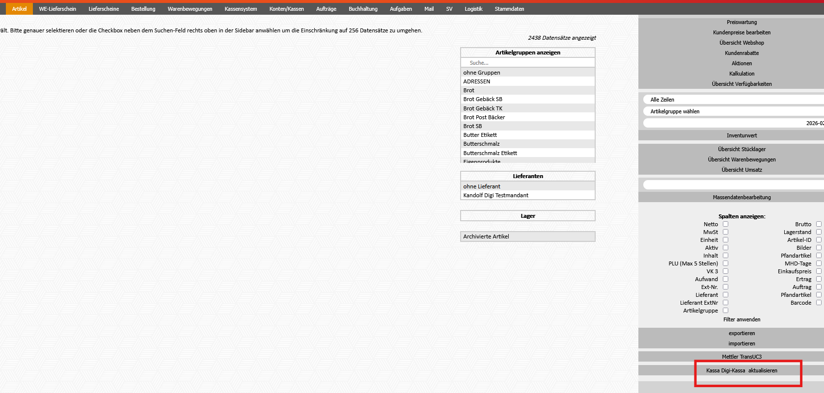 - In LotzApp einsteigen - Modul Artikel - Kassa aktualisieren (Button ist ganz rechts unten in der Funktionsleiste zu finden)