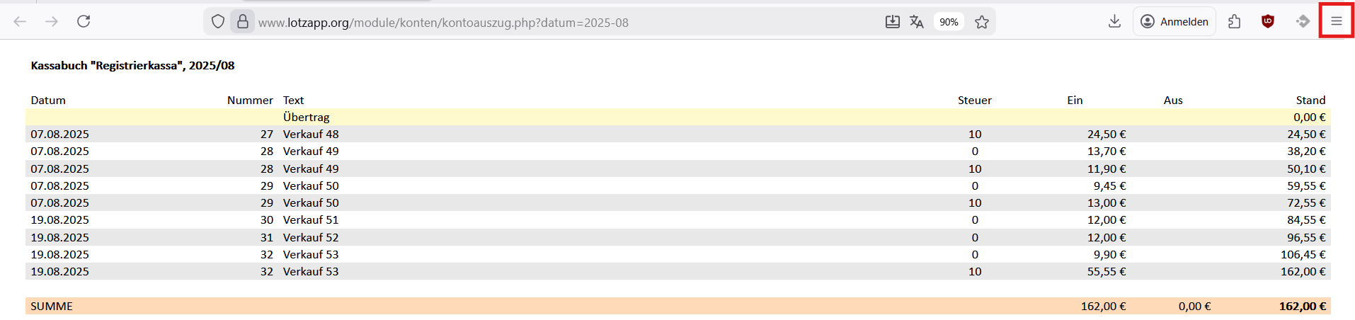 Im Kassabuch erhält man eine Übersicht über die einzelnen Umsätze der Kasse. Diese Ansicht entspricht grundsätzlich der Übersicht, die direkt auf der Registrierkasse angezeigt wird.
