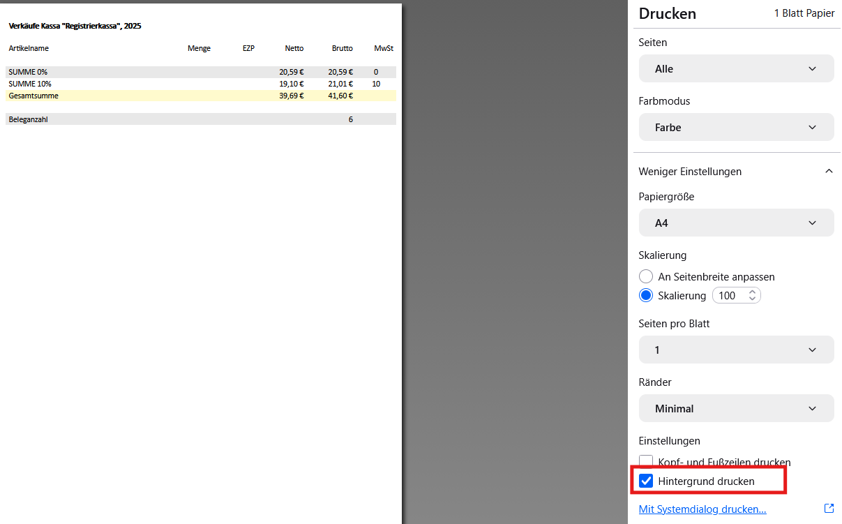 Für eine bessere Übersicht wird empfohlen, in den Druckeinstellungen die Checkbox "Hintergrund drucken" zu aktivieren, damit Farben und Markierungen korrekt angezeigt werden.