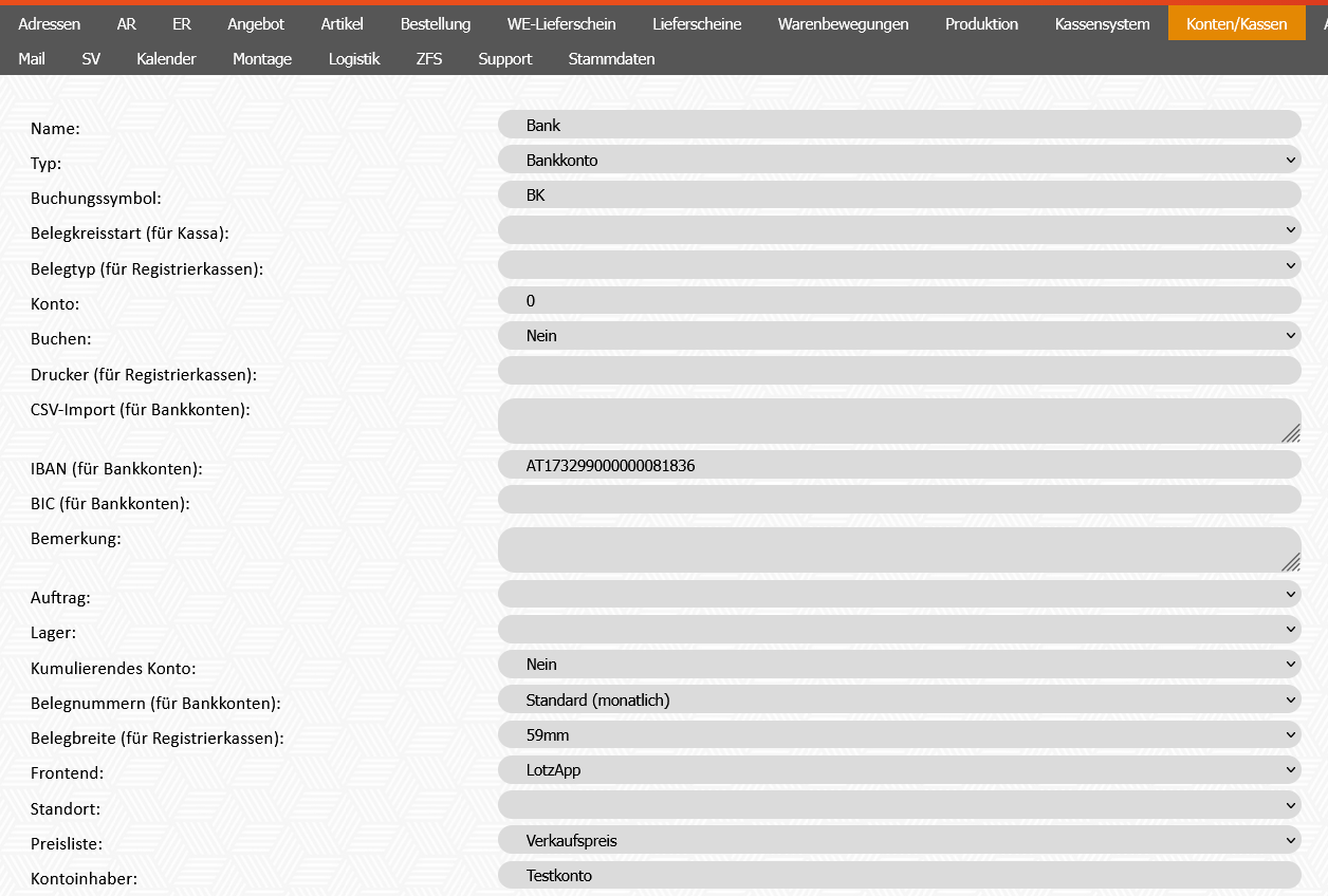 | Konto | Buchhaltunskonto für Kassa oder Bank (nur Relevant, wenn beim Feld "Buchen" "Ja" ausgewählt wurde | |