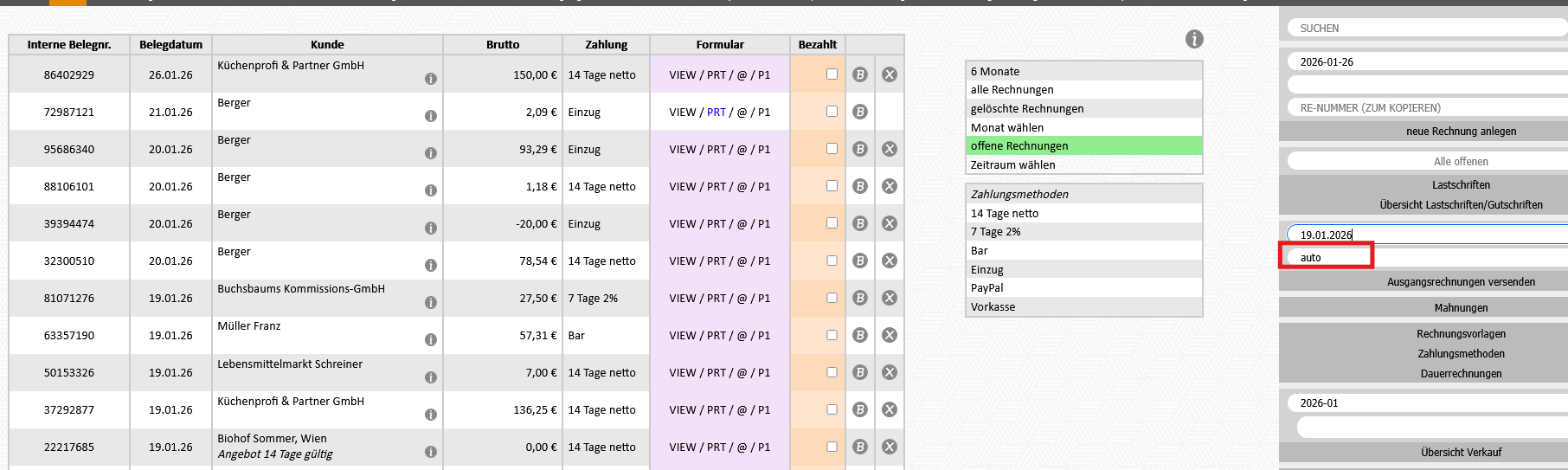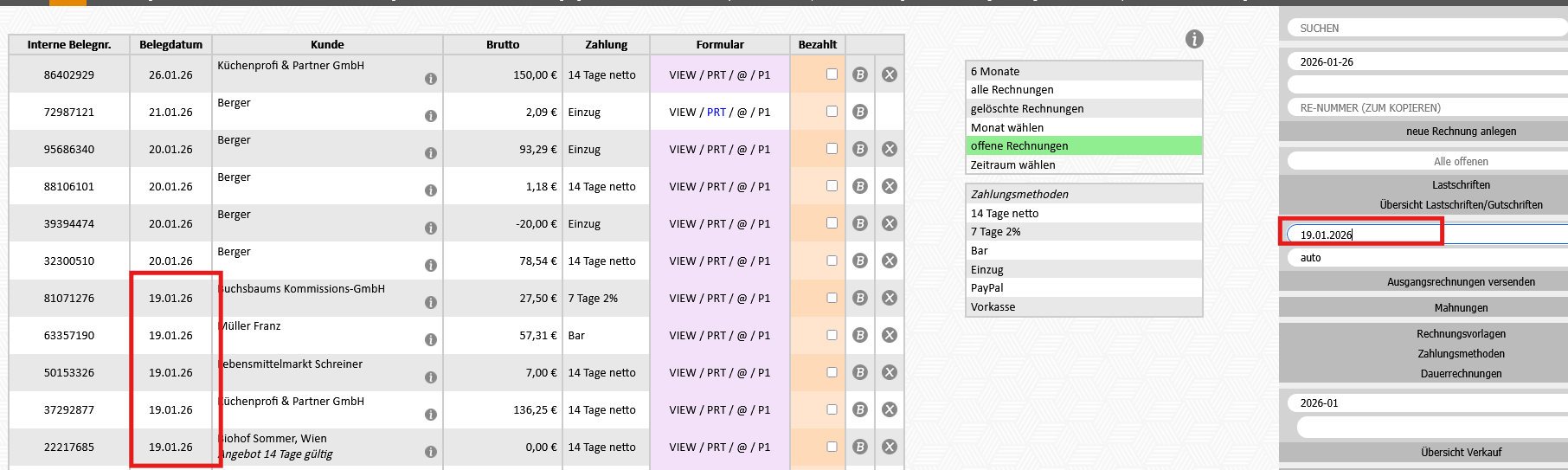 Eingabe "19.01.2026" - es werden alle Rechnungen mit Belegdatum 19.01.2026 verschickt
