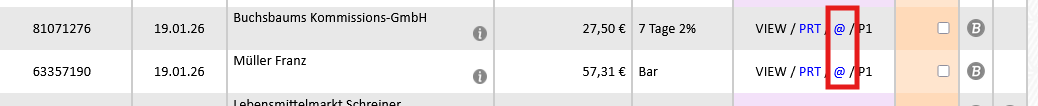 Wenn der Mail-Versand erfolgreich war, dann wird das @-Symbol bei den Rechnungen blau hinterlegt