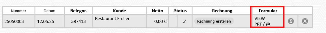 Durch Klick auf VIEW kann das Dokument beliebig oft angesehen werden, der Status ändert sich dadurch nicht. Der Lieferschein kann weiterhin gelöscht werden (ersichtlich durch das X am Ende der Zeile).