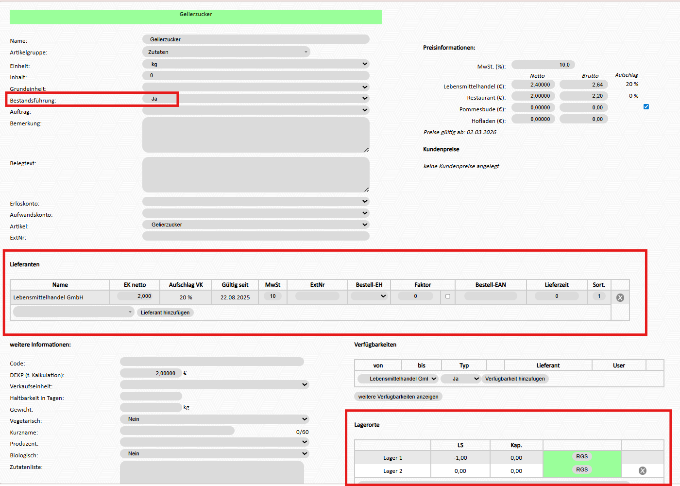 | Artikelgruppe | Artikelgrupp zuweisen (z.B. die zuvor angelegte Artikelgruppe "Zutaten" |
