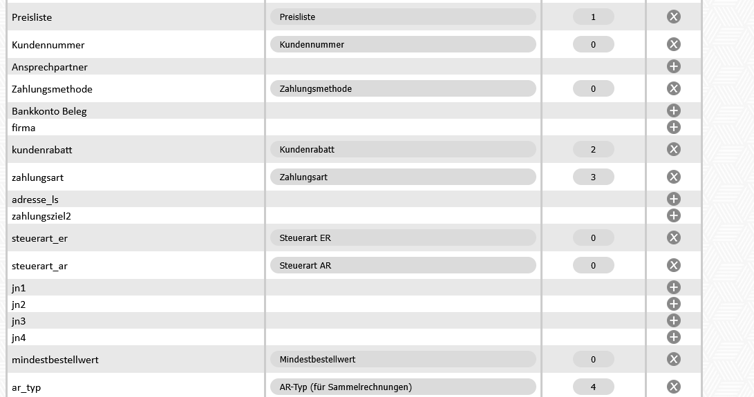 | kundenrabatt | Kundenrabatt | Rabatt in Prozent für den jeweiligen Kunden (Rabatt gilt auf alle Artikel und wird bei jedem Artikel einzeln abgezogen) | |