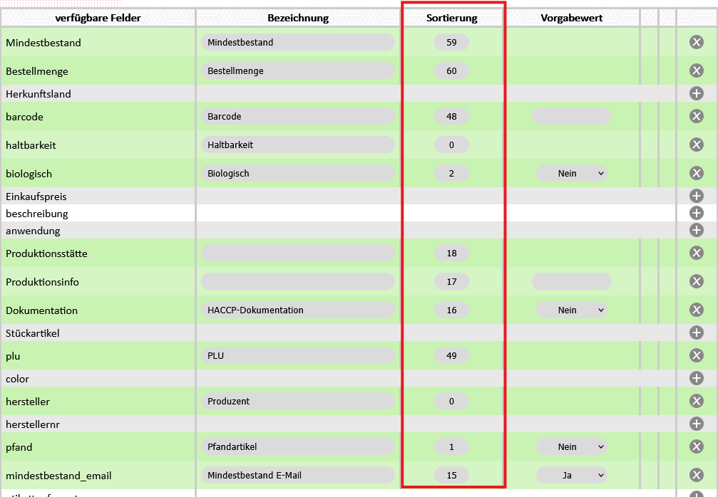 Die Felder werden je nach Nummerierung aufsteigend im Artikelschirm angezeigt. Ist 0 hinterlegt, so bleibt das Feld vor der ersten Sortiereung. Es können auch Nummerierungen ausgelassen werden um Platz für künftige Felder freizuhalten.