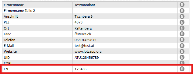 Die Firmenbuchnummer muss im Modul Stammdaten eingetragen werden: |