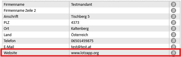 Die Website muss im Modul Stammdaten hinterlegt werden: |