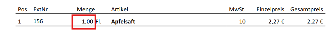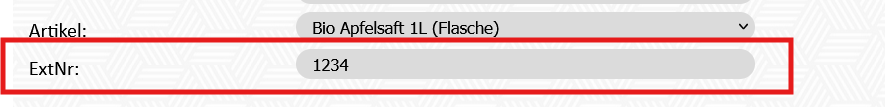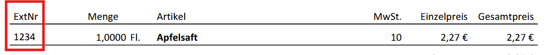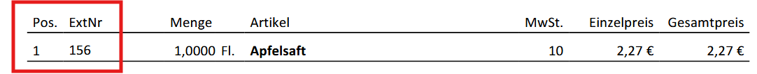 Beispiel: Um eine Nummer in dieser Spalte angezeigt zu bekommen, muss man im Modul Artikel - Artikel bearbeiten (B) - das Feld "ExtNr" befüllt haben id = Die Artikel ID wird als ExtNr am Beleg angedruckt.