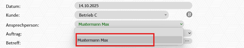 Beispiel: Damit der Ansprechpartner am Beleg angezeigt werden kann, müssen folgende Einstellugnen getroffen sein: