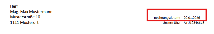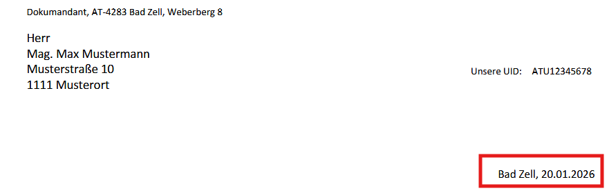 Ort, d.m.Y = Der Ort des Firmensitzes wird bei vor das Datum gestellt. Das datum wird wieder als DD.MM.YYYY angezeigt header d.m.Y =Das Rechnungsdatum wird in den Header des Beleges geschrieben mit dem Format DD.MM.YYYY |