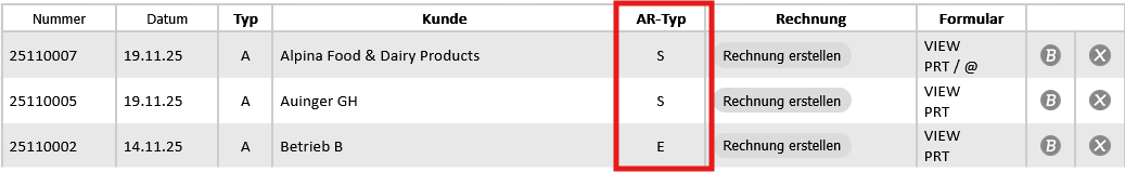 AR-Typ für Sammel- bzw. Einzelrechnung wird angezeigt E = Abrechnung des Kunden mittels Einzelrechnungen |